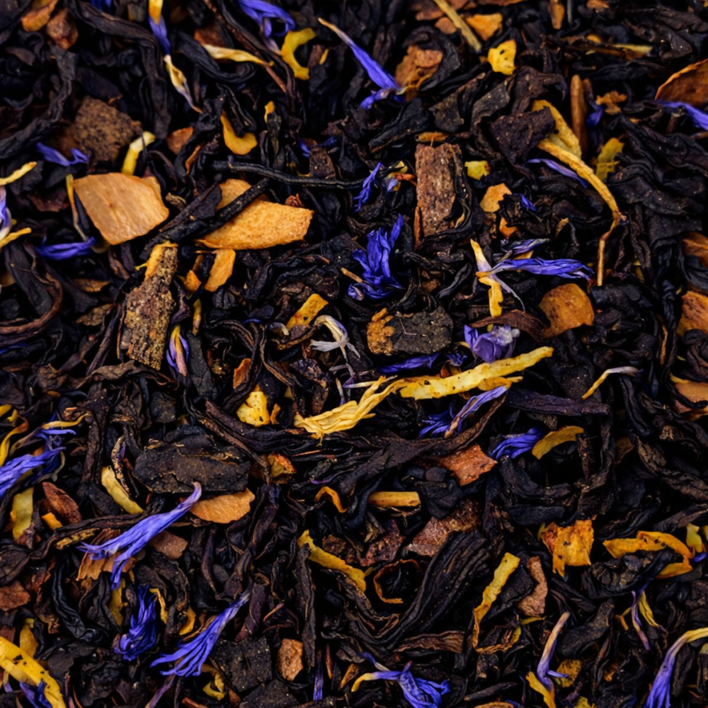 Té negro ceylon con cacao, coco, pétalos de aciano & rosas