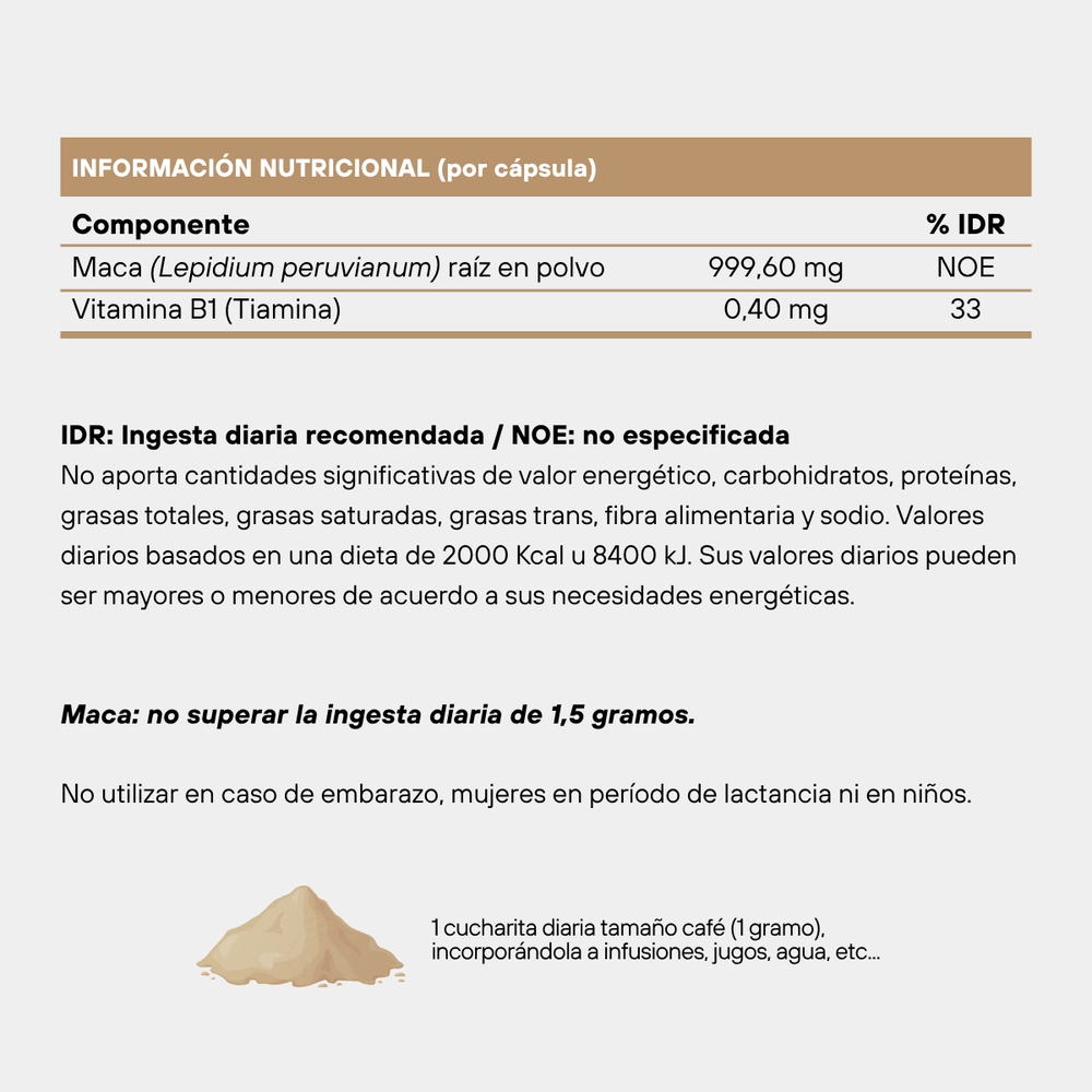 Descubrí el poder ancestral de la Maca peruana, una raíz adaptógena cultivada en los Andes que ha sido utilizada durante siglos por sus propiedades revitalizantes. Este suplemento natural está diseñado para acompañarte en tu día a día, potenciando cuerpo y mente con una fórmula pura y efectiva.