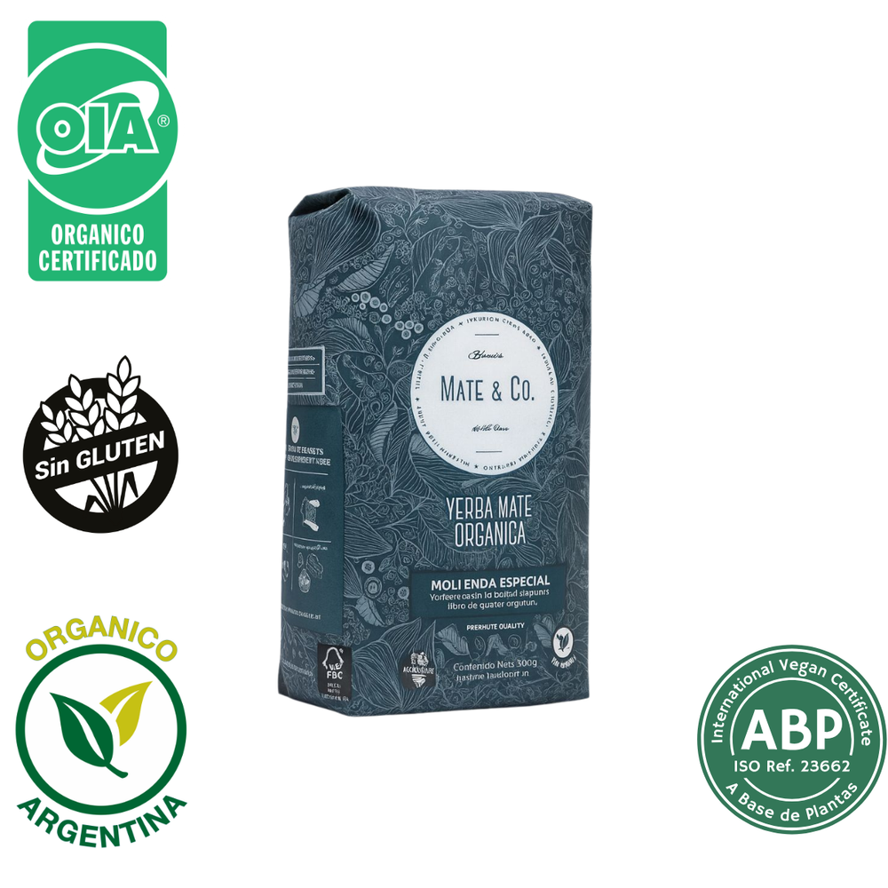 Yerba Mate Orgánica de molienda especial. Con hojas más grandes, despalada y con la cantidad justa de polvo de hoja. Es orgánica certificada y tiene 18 meses de estacionamiento natural.