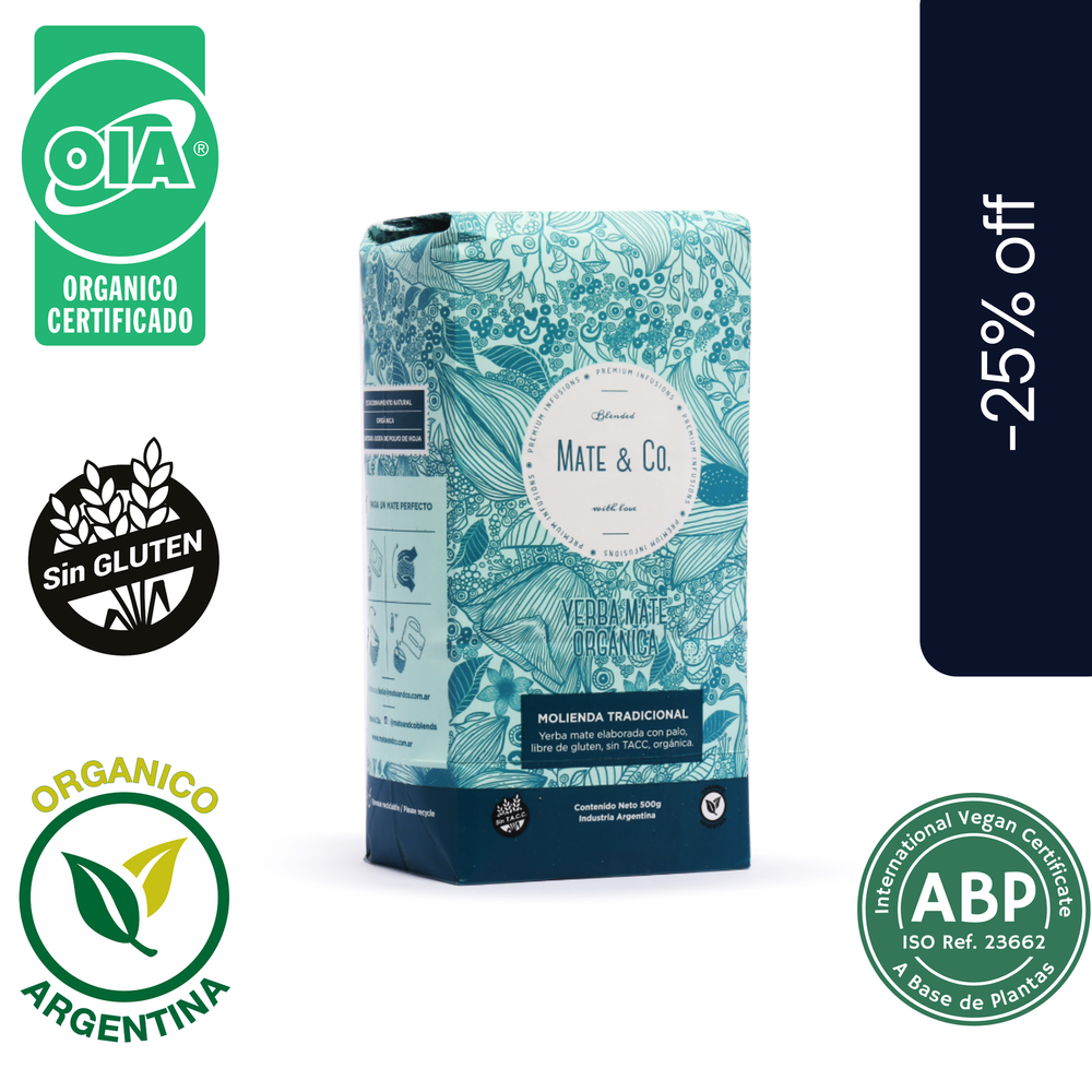 Yerba Mate Molienda Tradicional con palo, sin TACC, es clásica y Orgánica.