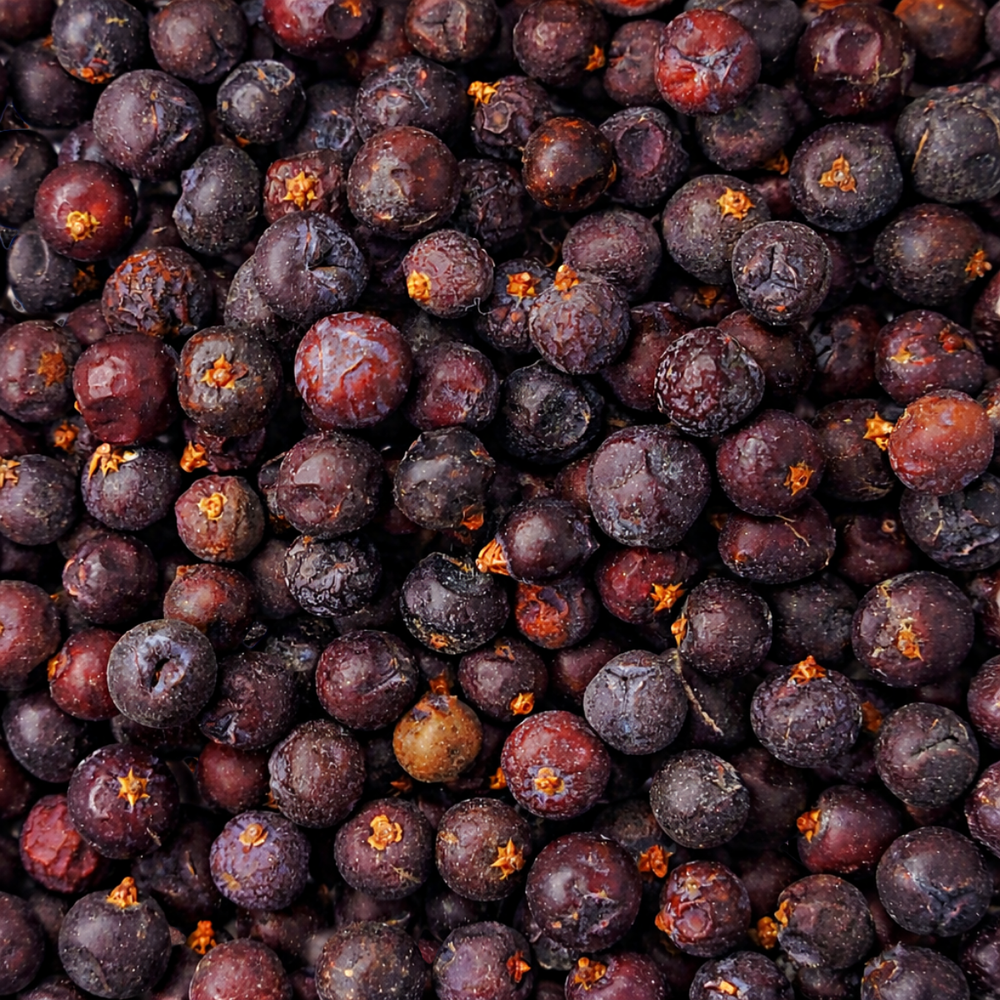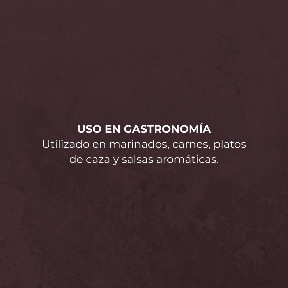 Resinosas, frescas y de carácter silvestre, las bayas de enebro ofrecen un perfil aromático único. Su sabor combina notas levemente cítricas, amaderadas y especiadas, con un fondo que recuerda al pino y a la cáscara de naranja. Su aroma es limpio, intenso y refrescante.
